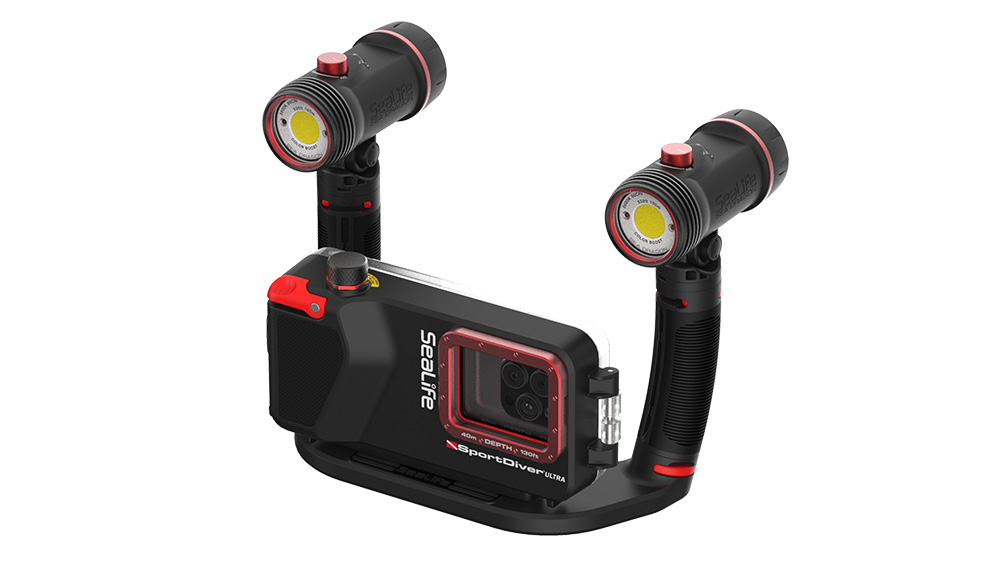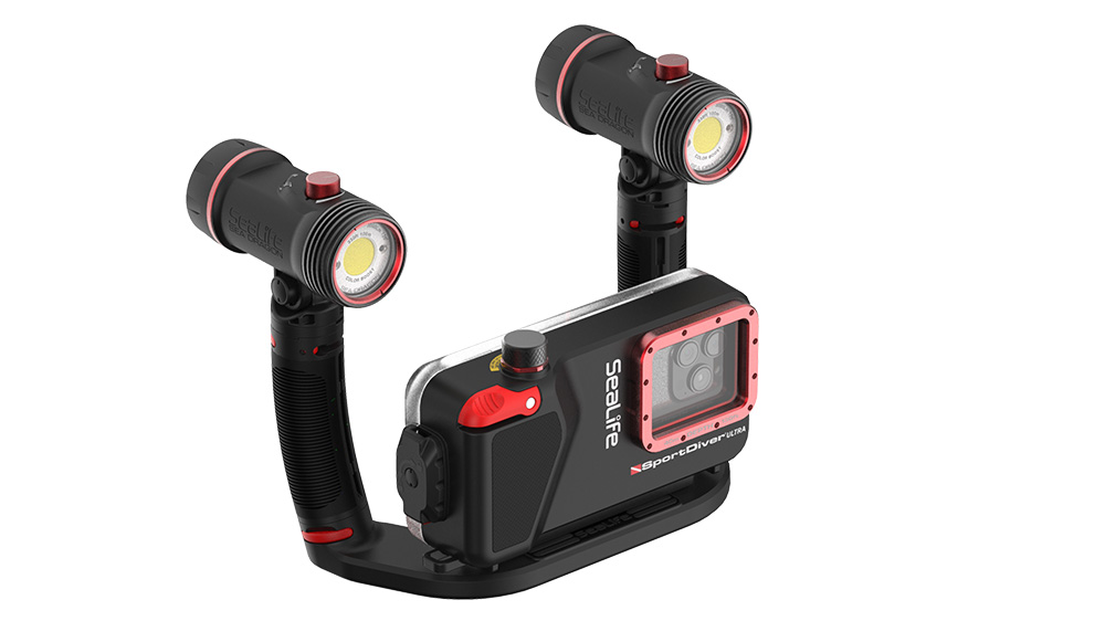 Bow-shaped dual tray provides ideal fit for the SeaLife SportDiver and other wide underwater camera housings. Mount two flashes or lights to your underwater camera to double brightness and reduce backscatter and shadowing. Tray can be oriented with grips and lights behind the housing or in front of the housing. Holding the camera with two grips increases stability. Rugged polycarbonate construction for reliable holding strength and stiffness. Mounts to any camera using a standard ¼-20 tripod screw. Two ¼-20 female tripod threads are located under the tray for adding lens dock or other accessories.