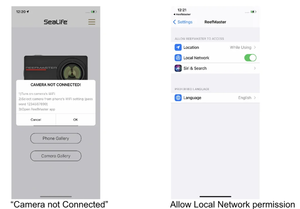If ReefMaster app shows “Camera Not Connected” message but iPhone Wi-Fi settings shows camera is connected, the Local Network have not been allowed. To allow Local Network permission, go to iPhone Settings, scroll down to ReefMaster app and allow Local Network.