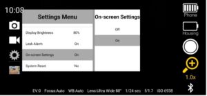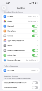 To enable the on-screen data on your iPhone, go to the phone Settings >>> Apps >>> SportDiver app, and enable “Display EV/AF/Lens and Exposure” located near the bottom.