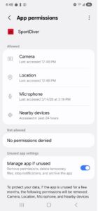 - Check the SportDiver app permissions and make sure they are all allowed. For iPhones, go to the phone settings, scroll down to the SportDiver app and accept all permissions. For Android, go to the phone settings, scroll down to Apps and select SportDiver – there you will find the app permissions screen.