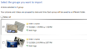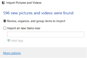 - After your Windows computer searches for pictures and videos, select “Review, Organize, and group items to import. And then select “More Options” on the bottom left of the screen.