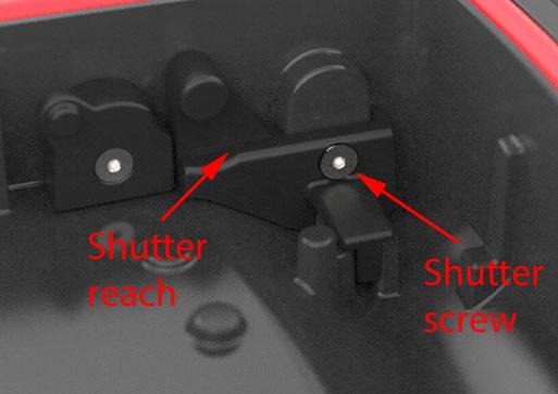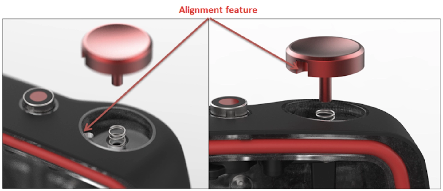 3. If you replace the shutter button reach, avoid disassembling the shutter button assembly by keeping the shutter button pushed down when the reach or reach screw is removed. If the external shutter button comes out (as shown below), make sure the alignment feature is aligned before tightening the screw.
