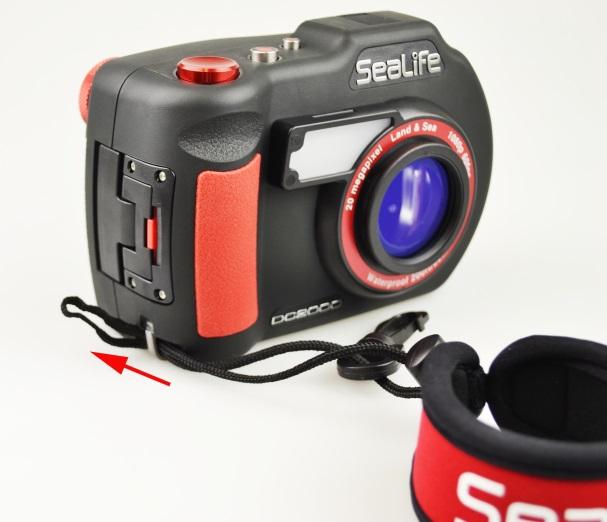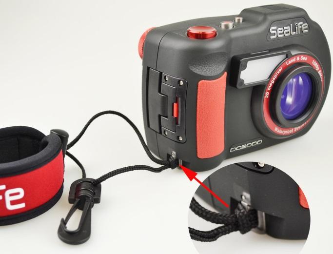 The housing wrist strap included with the DC2000 UW camera attaches to the housing as shown below.  Note: The clip is used for attaching the camera to your BCD (buoyancy Control Device) D-ring.