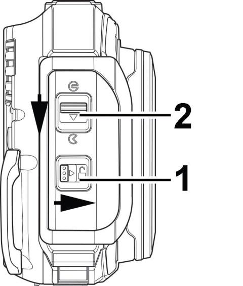 Open the waterproof door by sliding the lock right (1) and latch down (2), as shown below. When closing the waterproof door, push down tightly on the door and slide the latch up (2).  The lock will automatically engage.